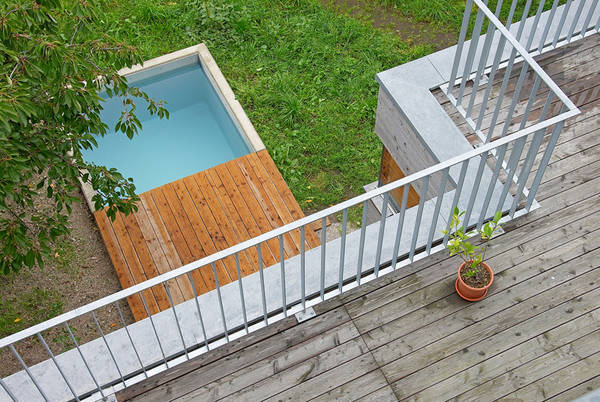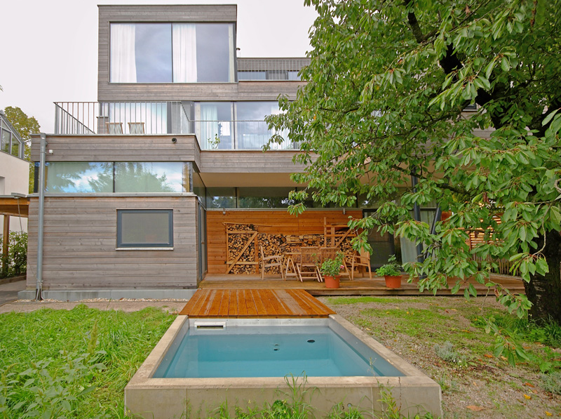 Wie die Umstimmung des Gatten erfolgte, ist nicht dokumentiert, jedoch setzte sich Frau Wukitsevits in den Kopf, einen damals eben auf den Markt gekommenen Living-Pool im Garten errichten zu lassen. Und setzte sich mit 9.000 Euro eine Obergrenze für die Kosten. Dem Planer der mit der Errichtung beauftragten Firma BIOTOP blieb kurz die Luft weg, er fand jedoch eine Lösung, die eine ideale Ergänzung zu Haus darstellt, ausreichende Abkühlung an heißen Tagen liefert und mit der asketischen Gestaltung perfekt in den „wilden" Garten passt.