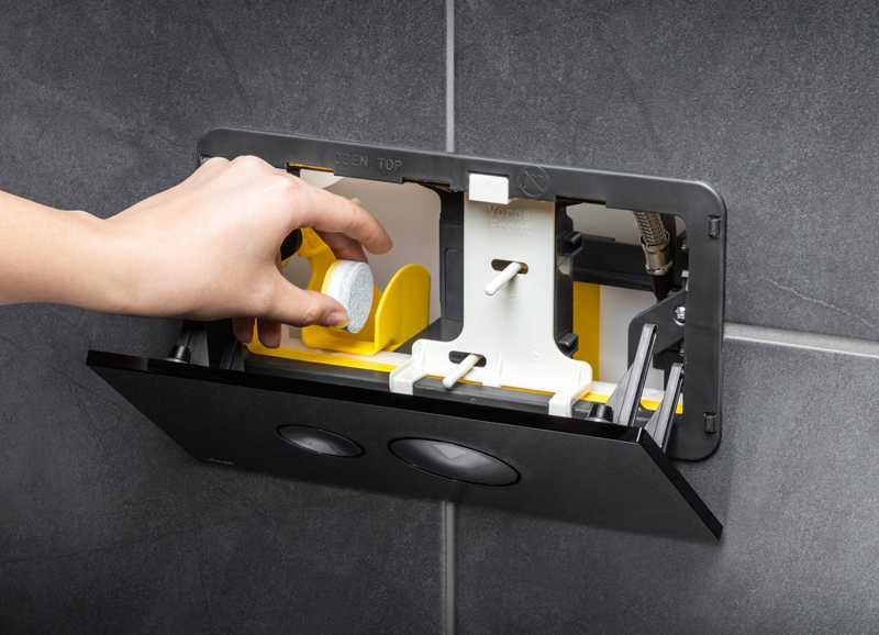 Die Konstruktion wurde eigens zur Kombination mit den modernen Betätigungsplatten aus der Visign for Style 10-Serie konzipiert. Daher passt sie zu vielen Unterputz-Spülkästen von Viega. Sogar eine Nachrüstung bestehender Systeme ist möglich. Das Prinzip ist so einfach wie das Bedienen des Waschmittelfaches bei der Waschmaschine: Klappe auf, Tab rein, Klappe zu. Im Inneren gleitet der Tab dann in ein spezielles Auffangkörbchen unter dem Wasserspiegel. Dort löst er sich auf und gibt kontinuierlich Reinigungsstoffe an das Wasser ab. Bei jeder Spülung wird die WC-Keramik gereinigt. Auch das Nachladen ist denkbar einfach: Die WC-Bestätigungsplatte einfach von dem magnetischen Einbaurahmen ziehen und wegklappen. Tab einlegen, Platte hochklappen, fertig. Die Magnete sorgen dafür, dass die Platte immer in die richtige Position gezogen wird. Für Erwachsene ist das Lösen kein Problem, für Kinder sicherheitshalber zu schwer. Über den – auch nachträglichen – Einbau informiert der Installateur.