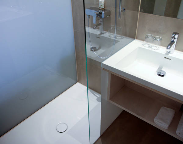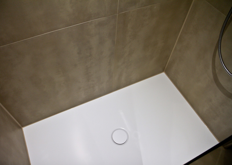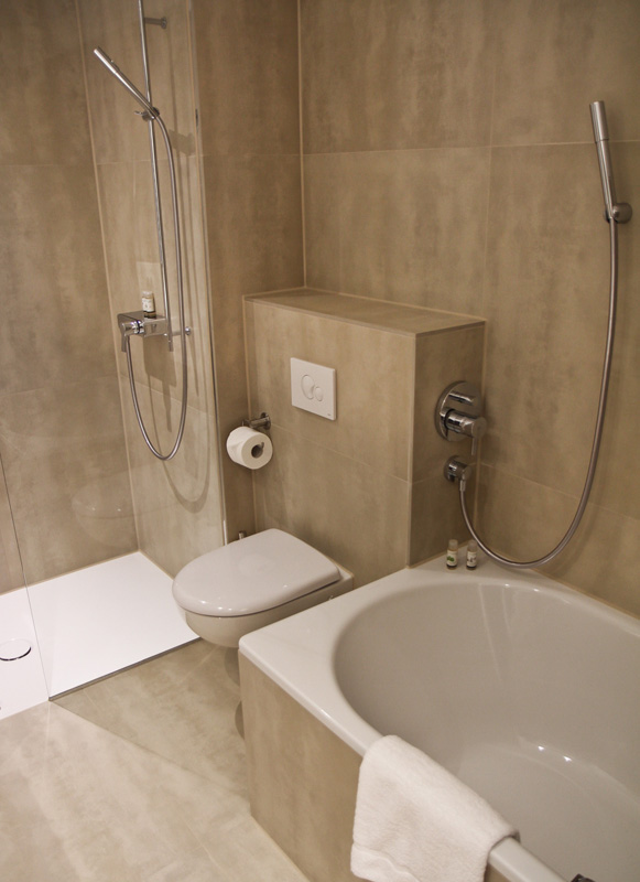 Bettefloor-Duschflächen sind in einer großen Maßvielfalt erhältlich. Im Bio-Hotel wurden sie mit einer Größe von 140 x 80 Zentimetern eingebaut. Michael Stober: „Ich wusste sofort: Das ist die ideale Lösung.“ Dass der Bauherr mit dieser Einschätzung richtig liegt, bestätigen ihm die positiven Resonanzen von Seiten der Gäste wie auch des Reinigungspersonals, das im Bio-Hotel nur mit ökologischen Putzmitteln unterwegs ist und sich über den geringen Reinigungsaufwand der Duschflächen im Alltag freut. Um auch die geflieste Wand im Duschbereich möglichst frei von Fugen zu halten, fiel die Wahl auf großformatige Fliesen (80 x 80 Zentimeter). „Bei der Gestaltung des Duschbereichs wurde im Millimeterbereich gearbeitet“, kommentiert Michael Stober.