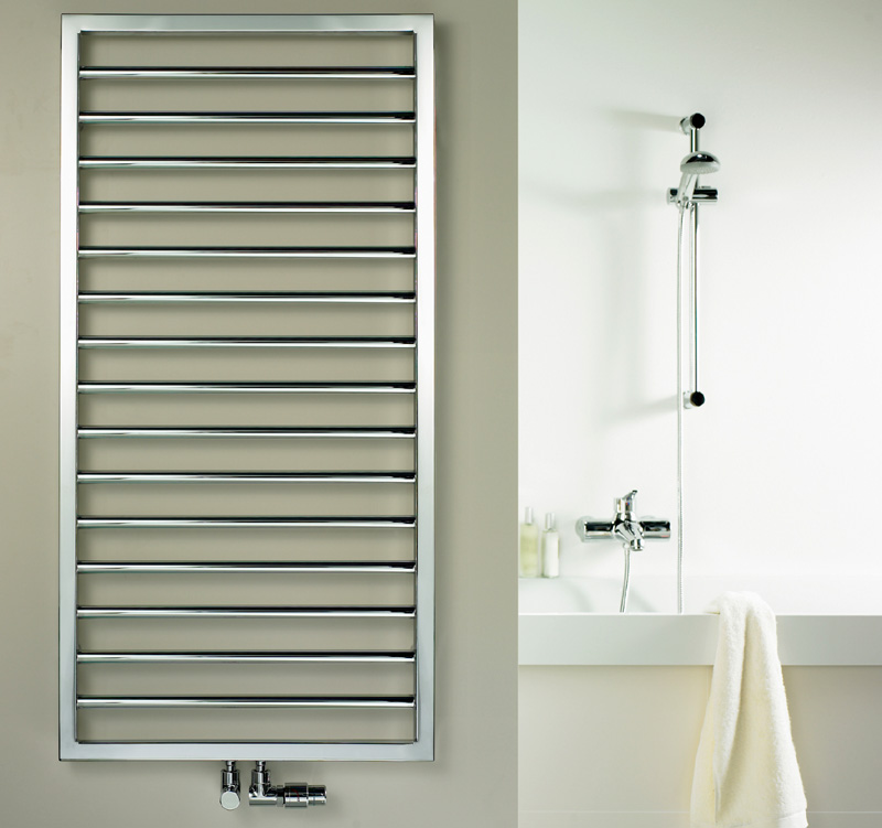 Das neue Designprodukt aus der Kreativpartnerschaft mit Villeroy & Boch zeigt die klassische Sprossenstruktur des Badheizkörpers in verfeinerter Form mit vergleichsweise großzügigem Abstand zwischen den Rundrohren von 46 mm. Neben dem Ästhetikaspekt erleichtert dieser Abstand das bequeme Einlegen der Handtücher.