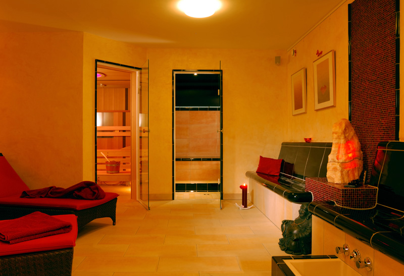 Raumgröße rund 30 Quadratmeter. Ausgestattung: Yin-Yang-Sauna mit Farblicht, multifunktionales Tecaldarium®, Ruhebereich mit Wärmebank und Fußbad, Vitaldusche mit üppiger Programmauswahl