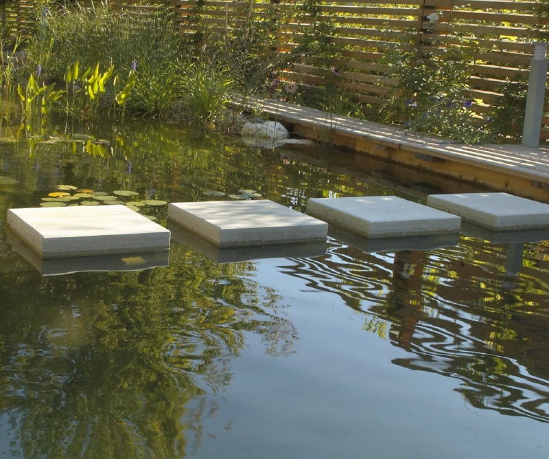 Schwimmteiche gehören in vielen Gärten schon fast zur Selbstverständlichkeit. Immer beliebter werden individuell geplante Trittsteine, die sowohl optische Leckerbissen als auch praktische Verkehrswege sind.