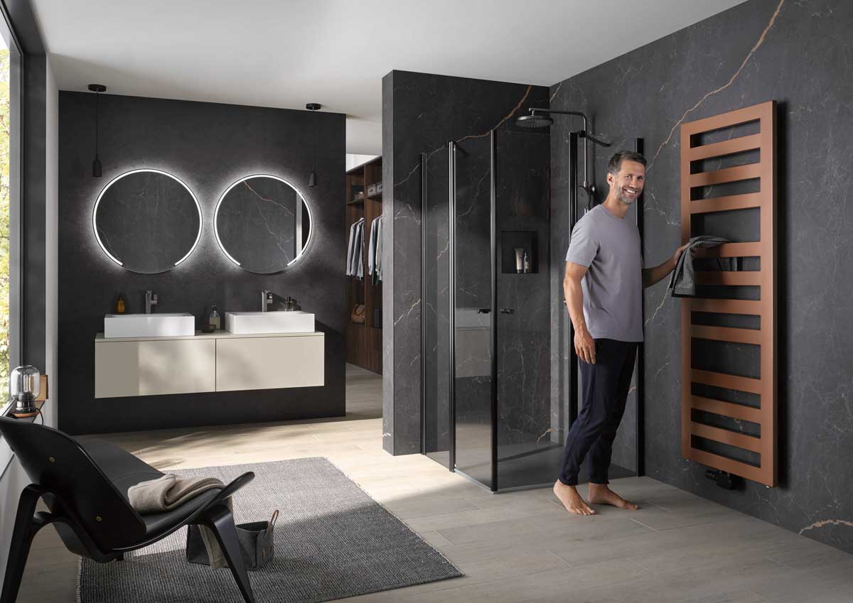 Zudem lässt sich die Farbe hervorragend mit verschiedensten Interior Designs und anderen Farbtönen kombinieren: Ob modern und exzentrisch in Kombination mit Schwarz-matt, romantisch-nostalgisch mit Pastellfarben wie Salbeigrün oder besonders warm und gemütlich mit Rosé- und Apricot-Tönen – Kupfer ist extrem anpassungsfähig. Damit Kupfer nicht antiquiert, sondern absolut up to date wirkt, ist eine klare, schnörkellose Formensprache wesentlich. Armaturen, Duschkabinen, Heizkörper und Wanddesigns von HSK unterstützen den cleanen Kupfer-Look mit geradliniger Formgebung und minimalistischem Design.