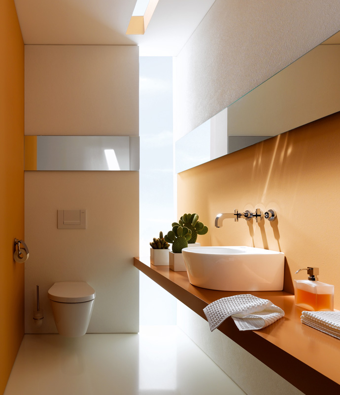 Das Keramikprogramm wird ergänzt durch perfekt abgstimmte Unter- und Seitenschränke, Lichtspiegel, Ablagen, Handtuchhaken und -halter, WC-Garnituren und andere Accessoires. Die 48 Seiten starke, kostenlose Broschüre zeigt bildschöne Szenarien und ist eine echte Hilfe bei der Planung einer attraktiven Gästetoilette.