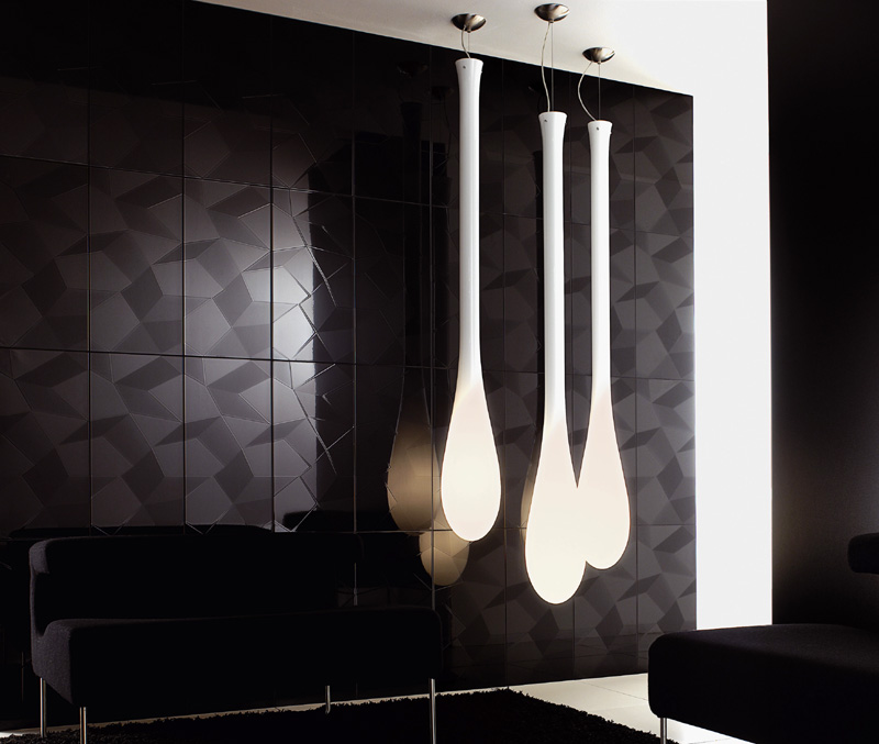 Diese Fliesenserie setzt auf spannungsvolle Kontraste und starke Harmonien und spielt dazu die Gegensätzlichkeit von Schwarz und Weiß voll aus. Mit kristallinen Formen, dreidimensionalen Effekten, Reliefbordüren, samtig anmutenden Oberflächen und großen Formaten inszeniert das Gestaltungskonzept das Thema Schwarz-Weiß in Keramik. Als Highlight bietet BiancoNero zwei Dekorthemen: Der von kristallinen Formen inspirierte Dekor vermittelt eine leichte, dreidimensionale Tiefe und unterstreicht das Spiel aus Licht und Schatten (großes Bild oben). Das zweite Dekorthema greift florale Motive auf und interpretiert sie abstrakt