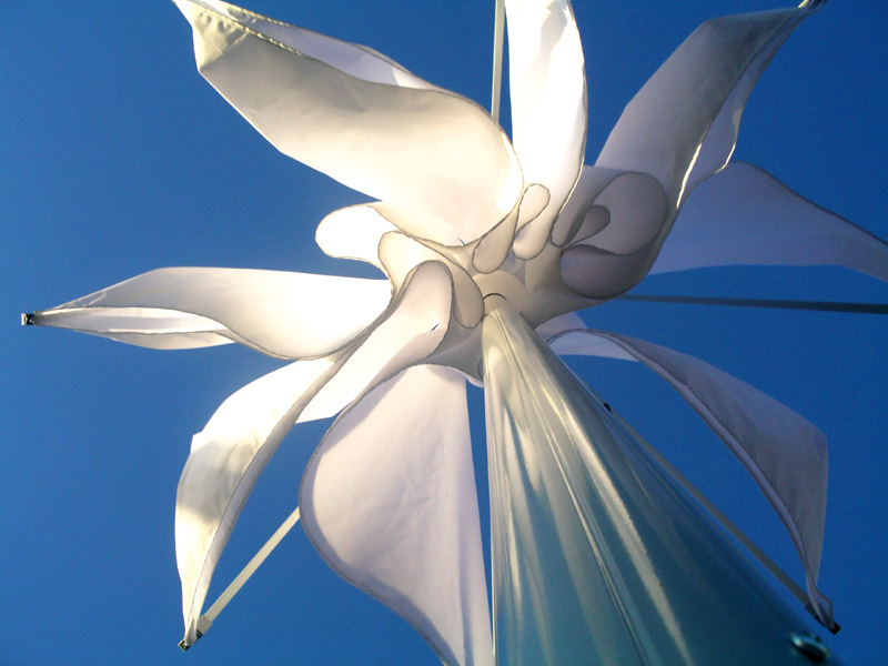 Die innovative Schirmkonstruktion erhält ihre unverwechselbare Form und Leichtigkeit durch die frei geschwungene, ausschließlich von oben gehaltene Segelfläche. So gelingt die verblüffende Synthese zwischen der Freiheit und Eleganz eines gespannten Sonnensegels mit der Flexibilität und Funktionalität eines mobilen Schirmsystems. Es schafft bei Tag oder effektvoll beleuchtet bei Nacht einen Aufenthaltsbereich mit einzigartiger Atmosphäre. Zu verdanken ist die raffinierte Kreation der Beteiligung von Experten wie Architekten und Membraningenieuren, die auch an eine möglichst einfache Bedienung gedacht haben. Die Schirme lassen sich je nach Größe über ein Seilzug- oder Teleskopsystem leicht öffnen und schließen.