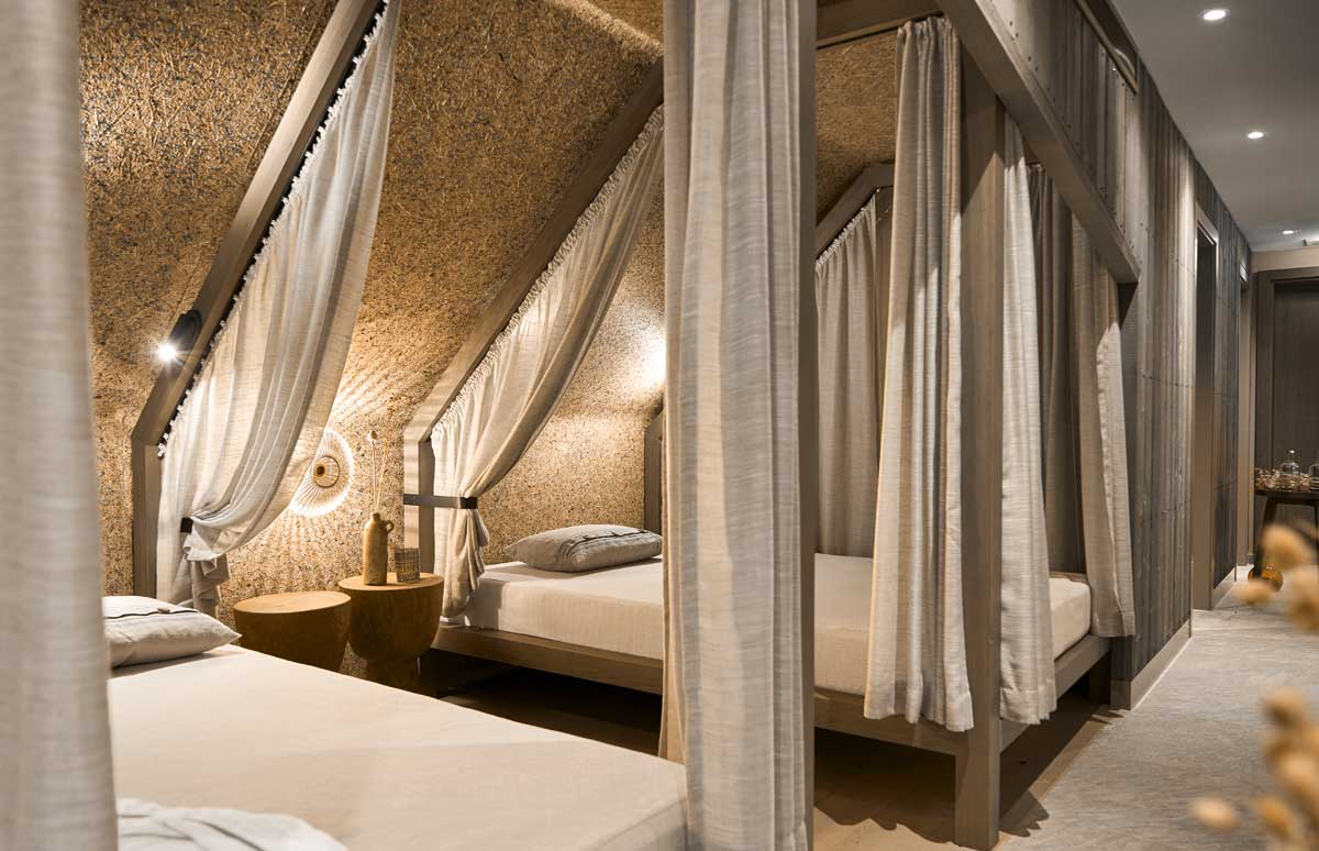 Hoteldirektor Heiko Buchta legte bei der SPA-Gestaltung großen Wert auf die Verwendung von Naturmaterialien: „Wir haben eine Dusche aus Naturstein, Wandvertäfelungen aus Massivholz, unsere Bio-Sauna ist mit über 800 Schieferschindeln verkleidet und die Day-Beds lassen sich mit Leinenvorhängen abtrennen. Heu-Tapeten vermitteln den Eindruck, als wäre man in einem echten Stadl. Gästen möchten wir mit diesen naturverbundenen Elementen die Möglichkeit geben, dem Stadtalltag zu entfliehen und in Gedanken aufs Land zu reisen.“ So findet sich in der Schwitzstube, die den in die Jahre gekommenen „Maurischen Kiosk“ abgelöst hat, eine Mischung aus klassischen Materialien, nostalgischen Dekorelementen und einer modernen, fast minimalistischen SPA-Gestaltung. „Wir bilden ein Spannungsfeld zwischen traditionellen Materialien und modernen Werten, spielen mit der Farbgebung und bearbeiten die heimatverbundenen Materialien oft auf innovative Weise“, so Buchta. „Dieser Spagat gelang uns bereits im Restaurant Pfistermühle sehr gut.“
