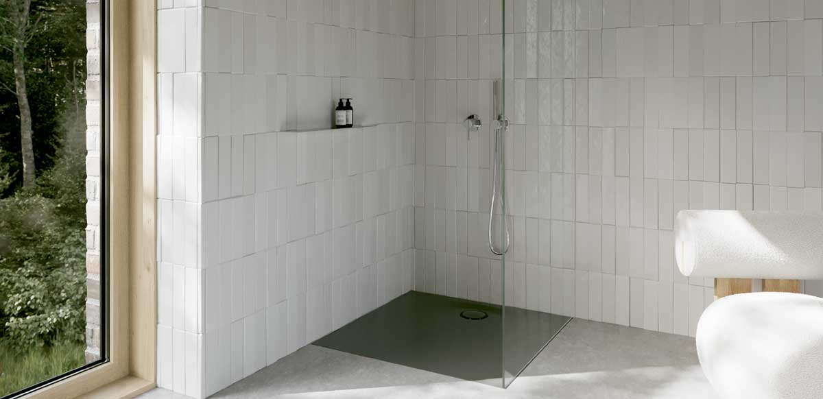 Ein besonderer Nutzen liegt in der durchdachten Geometrie der Duschfläche. Sie führt das Wasser auch bei der extrem flachen Bauweise sicher und sauber zum Ablauf. So entsteht ein puristischer Duschplatz, der nicht nur leicht und großzügig wirkt, sondern im Alltag auch zuverlässig funktioniert. Die geringe Aufbauhöhe wird damit nicht zum Kompromiss, sondern zum echten Komfortgewinn. Der wandnahe Ablauf auf der schmalen Seite schafft zudem eine angenehme, durchgehende Standfläche und unterstützt die klare architektonische Anmutung.
