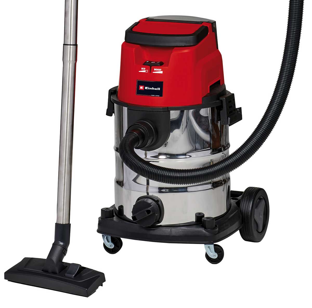 Dank der Twin-Pack-Technologie von Einhell, werden bei dem neuen Akku-Nass-Trockensauger TE-VC 36/25 Li S einfach zwei kraftvolle 18 Volt Power X-Change Akkus in den Sauger eingesteckt. Sie bringen die nötige Leistung mit, um effizient trockenen Staub, Flüssigkeiten, kleinen Schutt oder anderen Unrat aufzusaugen. Über die beiden Geschwindigkeitsstufen Boost & Eco kann der Anwender wahlweise zwischen hoher Saugleistung oder langer Akku-Laufzeit wählen. Mittels Wasserablassschraube im rostfreien 25 Liter Edelstahlbehälter wird das eingesaugte Schmutzwasser komfortabel abgelassen. Mit den verschiedenen Düsen gehören auch Polstermöbel oder Autositze zum vielseitigen Einsatzgebiet des Kombigeräts. Schwer zugängliche Stellen werden über den Blasanschluss gereinigt. Das umfangreiche Zubehör lässt sich über praktische Halterungen direkt am Gerät aufbewahren. Zwei große Räder und Rollen ermöglichen einfachen Transport und die nötige Mobilität.
