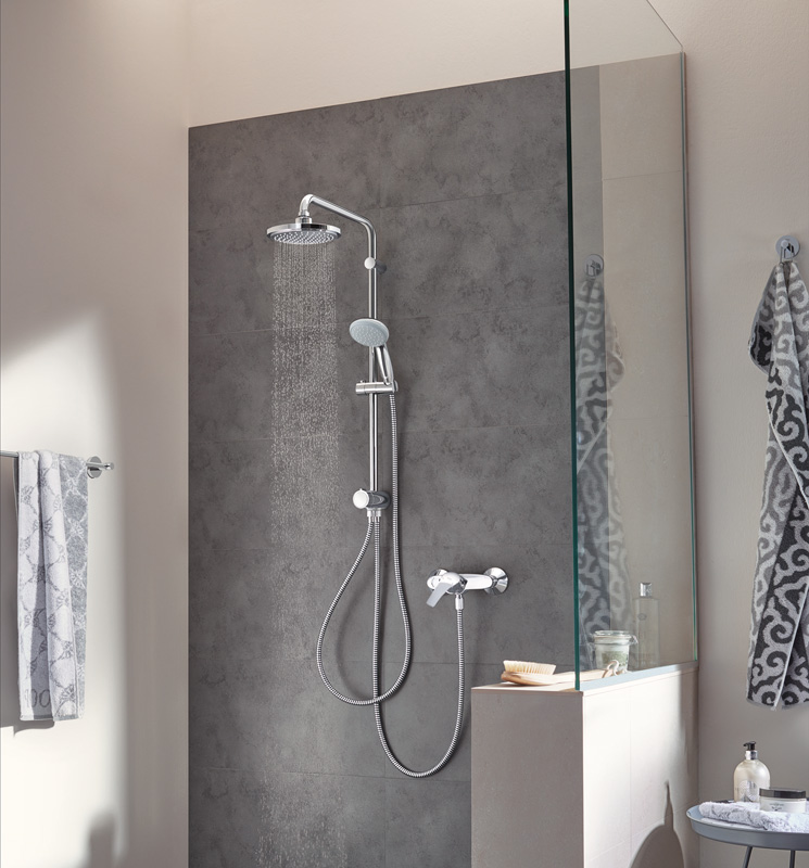 Statt mit einer Brause kommt das Flex Duschsystem gleich mit zweien daher: Einer Tempesta Kopfbrause mit zwei Einstellungsmöglichkeiten (Rain oder SmartRain) und einer passenden Handbrause. On Top gibt es von Grohe die typischen Qualitätsmerkmale fürs Einstiegssegment. Dazu gehören neben der „Made in Germany“-Versicherung auch praktische Technologien wie Grohe DreamSpray® für perfekte Strahlbilder, SpeedClean für eine schnelle Reinigung der Silikondüsen und Grohe StarLight® für langlebige Chromoberflächen.