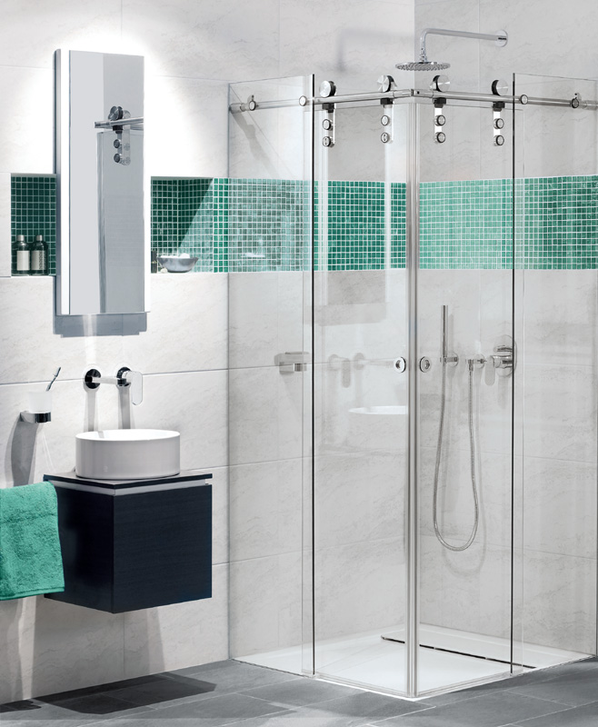 Der große Vorteil von Schiebtüren liegt in der fehlenden Ausladung der Türflügel. Dadurch ermöglichen sie auch in mittleren und kleinen Bädern einen großen, bequem Zutritt zur Dusche. Eine komfortables System hat Glamü mit seiner neuen Dusch-Serie Manet aufgelegt