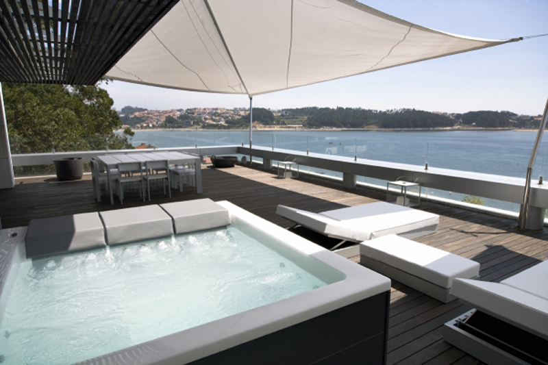 Freunde moderner Architektur werden an dem Hydromassage-Export aus Portugal ihr Vergnügen haben: Klar und geradlinig präsentiert sich der Whirlpool Lounge Concept und fügt sich harmonisch in ein modern geprägtes Ambiente im Außenbereich.
