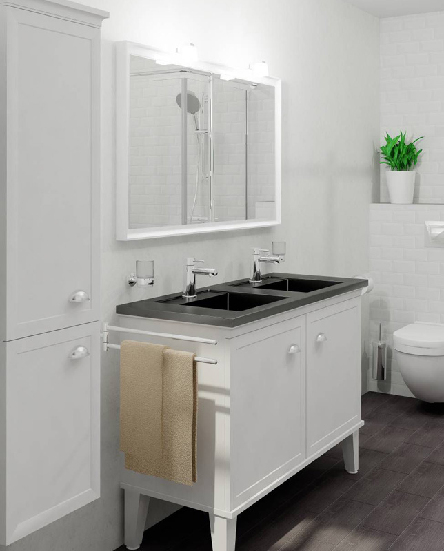 Die klassisch-moderne Linie Canto ist vom Landhausstil inspiriert. Rustikale matt-weiße Möbel werden mit der Eleganz von dunklem Granit kombiniert. Ein angenehmes Detail sind die Schubladen mit Slow-Close-Funktion – kein unschönes Zuschlagen reisst den Badnutzer aus seiner Entspannung.