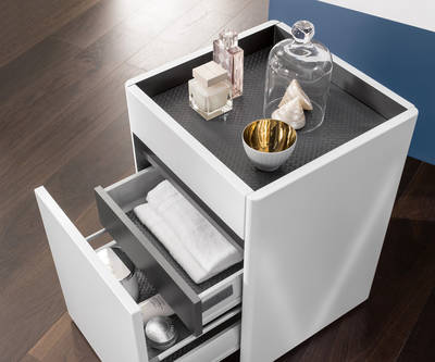 Die Möbel von Vivia sind wahre Multitalente, elegant mit viel Nutzungskomfort und Stauraum. Für alle Waschtischgrößen gibt es einen Unterschrank dessen Innenfächer flexibel unterteilt werden können. Die Auszüge sind mit einer Antirutsch-Matte ausgestattet und lassen sich mit praktischen Accessory Boxen bestücken. Eine clevere Waschplatzlösung lässt sich mit der Waschtisch-Konsole realisieren, vor der man bequem mit dem Rollhocker sitzen kann. Die Waschtisch-Konsole bietet praktische Extras wie einen klappbaren Spiegel in Sitzhöhe, einen geschlossenen Stauraum und eine zusätzliche Ablagefläche zwischen Waschtisch und Spiegel und vieles mehr. Ein großzügiger Hochschrank bietet ausreichend Stauraum für beispielsweise Handtücher oder Pflegeprodukte.