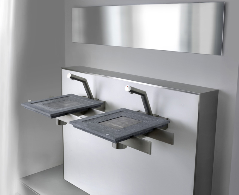 Nur 35 mm hoch sind die  wie "freischwebend" angebrachen Waschbecken mit attraktivem Edelstahl-Abflussrost