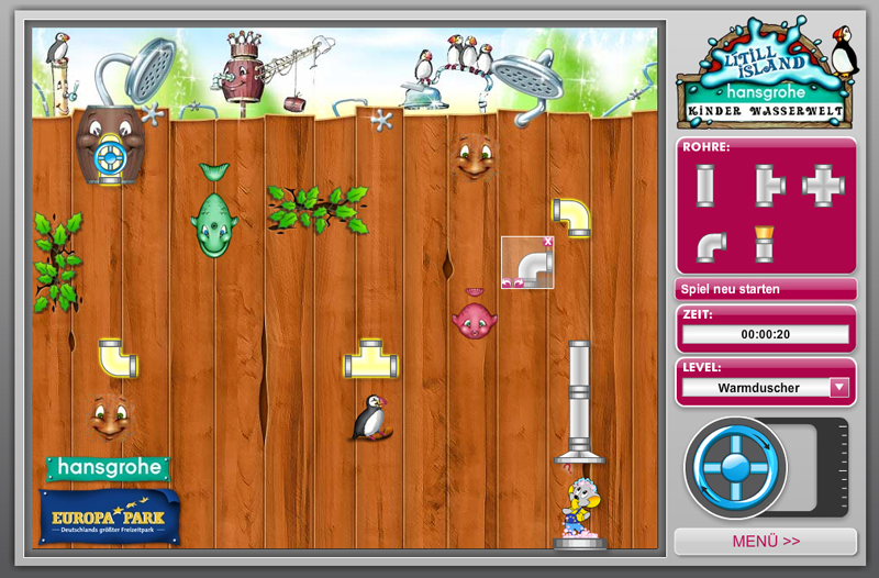 Da die Euromaus gerne duschen möchte, die Wasserleitung aber noch nicht fertig ist, sind die Teilnehmerinnen und Teilnehmer gefragt: Sie müssen die Rohre so anordnen, dass das Wasser tatsächlich bei dem Maskottchen des Europa-Park ankommt und kein Tropfen verloren geht. Nebenbei gilt es, Fragen rund um die Hansgrohe Wasserwelt zu beantworten.