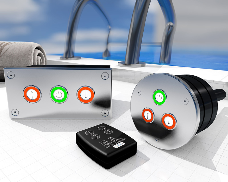 Im Pool kraftvoll gegen den Strom schwimmen - das funktioniert besonders gut mit einer Gegenstromanlage wie die patentierte HydroStar von Binder. Die Anlage arbeitet mit Turbinen und soll deshalb im Gegensatz zu pumpengesteuerten Konzepten eine breite, gleichmäßige Strömung erzeugen. Auf diese Weise entsteht ein angenehmes, naturnahes Schwimmgefühl. Bedient wird die Anlage direkt aus dem Schwimmbecken heraus – entweder über Funkfernsteuerung oder Piezo-Taster. Bisher wurden diese Taster standardmäßig mit einer runden Abdeckplatte ausgeliefert. Da der Einbaukasten der Gegenstromanlage eckig ist und manche Kunden ein einheitliches Design von Anlage und Bedienelementen wünschen, hat Binder jetzt das Angebot um eine rechteckige Version erweitert.