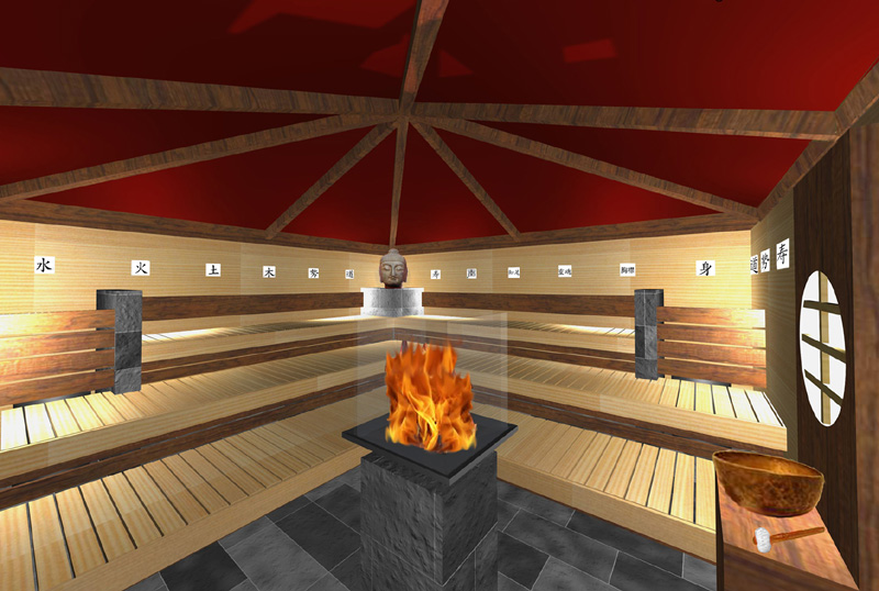 Die massiven Polarfichte-Blockbohlen aus der eigenen finnischen Produktion gehen für die Architektur der SOINTI eine harmonische Beziehung mit fernöstlichen Elementen ein. Im Saunaraum animiert das Spiel einer offenen Flamme, den eigenen Gedanken freien Lauf zu lassen. Unter der glatten, tiefroten Decke fühlt sich der Gast auch optisch gleich von einer besonderen Wärme umgeben. Zwei mit Schiefer verkleidete Saunaöfen sorgen für optimale Strahlungswärme und damit bestes Saunaklima. Auf kleinen Ablagen warten Klangschalen auf ihren Einsatz: Der Yogi oder Saunameister erzeugt durch die Wahl des Klöppels beim Schlag unterschiedliche Töne, spricht leise Mantras, lädt zur Meditation ein. Dazu umspielen sinnliche Düfte die Nase, verstärken dadurch die Ruhe in jedem einzelnen Badegast.