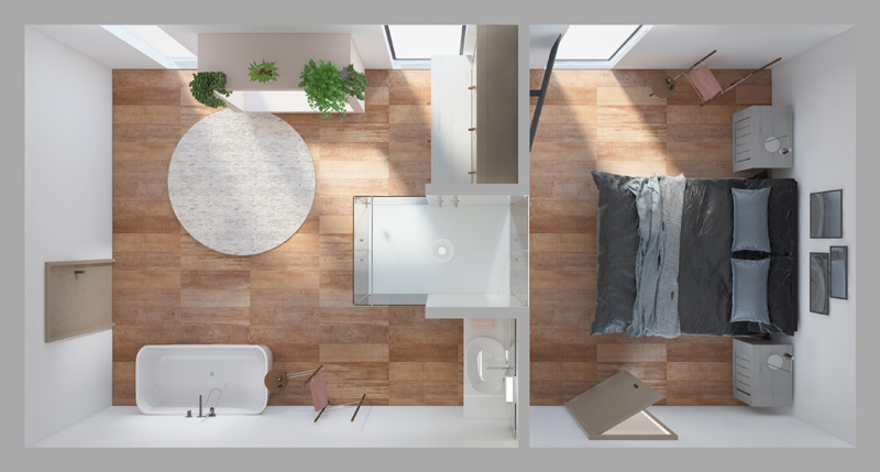 Die Duschabtrennung Josephine mit Zugängen von beiden Seiten verbindetet Bad und Schlafzimmer