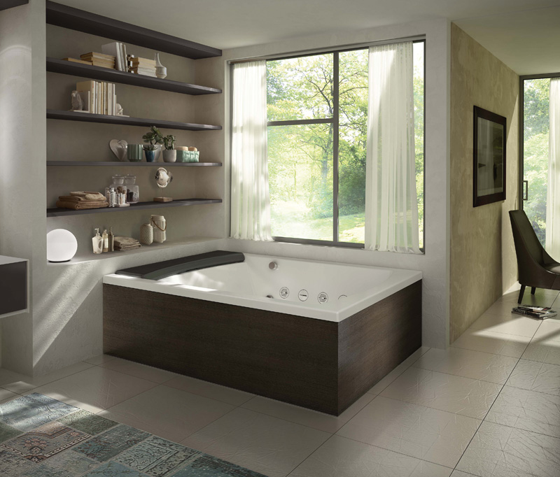 Die Wanne ist sowohl als Einbauversion in weißem Acryl als auch mit holzverkleideten Wannenschürzen erhältlich. Sie verfügt über eine stoffverkleidete aufklappbare Abdeckung, die als Kopfstütze dient und in der sich die versenkbaren Armaturen sowie ein Flachstrahleinlauf befinden.