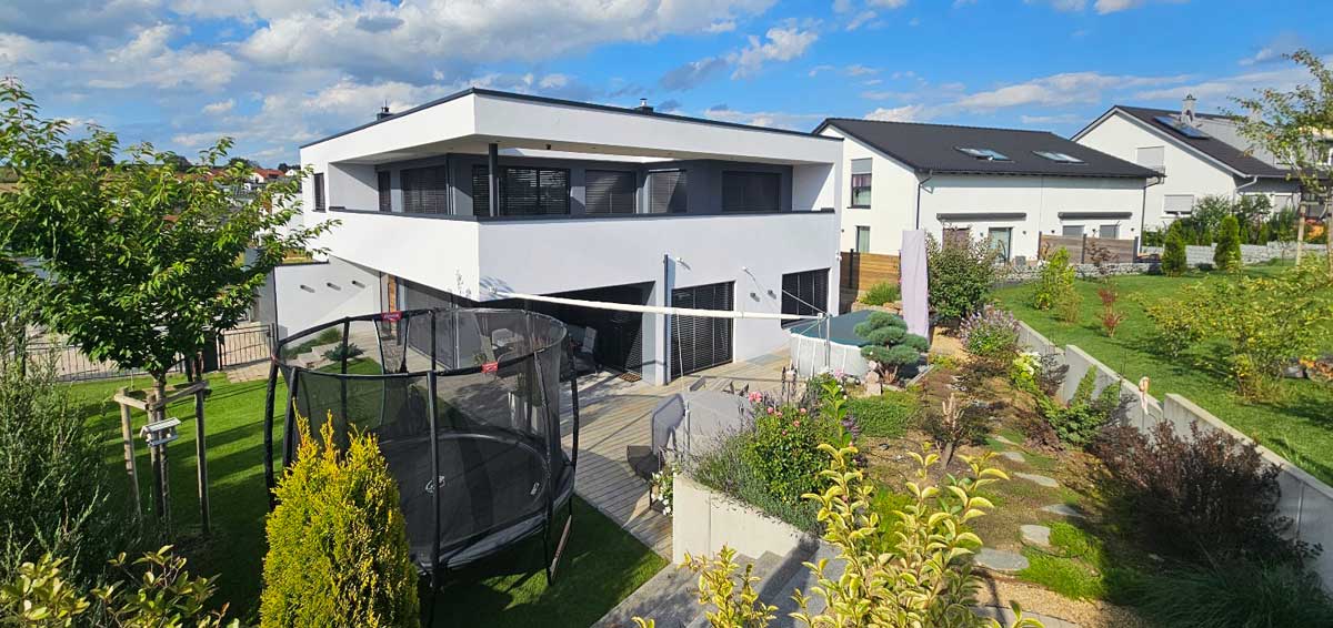 Die moderne Haustechnik des Kubus-Baus in Dasing bei Augsburg erfüllt sämtliche Ansprüche an energieeffizientes Wohnen. Für Bauherr Daniel Schaffer spielte neben einem nachhaltigen Wohnkonzept auch das Thema „Frische Raumluft“ eine zentrale Rolle. „Als Allergiker lege ich großen Wert auf gute Wohnraumluft. Ein Lüftungsgerät mit integrierten Pollen- oder Aktivkohlefiltern verhindert, dass Schadstoffe und unangenehme Gerüche der nahen Landwirtschaft in den Wohnbereich gelangen. Das hilft mir sehr und reduziert spürbar meine allergiebedingten Beschwerden – Zuhause kann ich Durchatmen.“, erklärt Herr Schaffer seinen Standpunkt für die Relevanz von frischer Luft in Innenräumen.