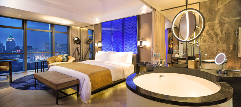 Hip, modern und hochwertig – das sind die Werte des Designhotels in bester Lage, quasi gleich neben der Verbotenen Stadt und dem Platz des himmlischen Friedens. Verantwortlich zeichnen hier das internationale Architekturbüro RTKL und die Innenarchitekten von AB CONCEPT aus Hongkong. Spektakuläre Installationen, lebhafte Farben und ungewöhnliche Materialien werden durch eine spezielle Beleuchtung in Szene gesetzt. Dieses Konzept wird auch in den Bädern und Waschräumen des Hauses umgesetzt.