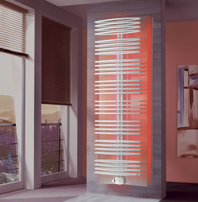 Luxus-Badwärmer Samba 1 oder Samba 2 plus Lichtpaneel Vario-Multicolor, Lichtpaneele in transluzentem Opalweiß, Heizkörper in beliebigem Farbton und in Chrom