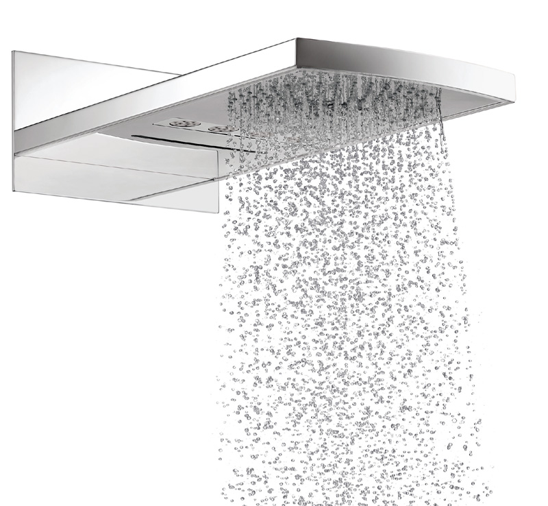 In Zusammenarbeit mit den Entwicklungspartnern von Phoenix Design, Stuttgart/Tokio, ist laut Hersteller das weltweit erste horizontale, multifunktionale Duschpaneel mit Schwallstrahl entstanden – ein völlig neuer Archetypus einer Kopfbrause. Bündig und ohne den für konventionelle Kopfbrausen typischen Brausearm an der Wand montiert, ragt das extrem flache, rechteckige Paneel, das durch seine elegant schlanke Gestalt und zurückhaltende Formensprache besticht, in den Raum.