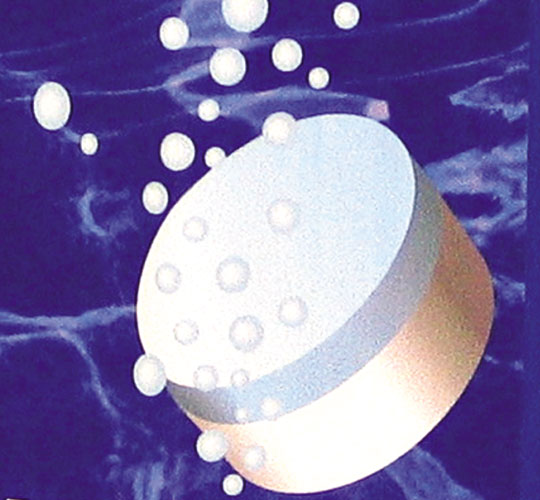 Die untere weiße Tablette löst sich langsam auf und wirkt für etwa 1 bis 2 Wochen gegen Bakterien, Viren und Pilze. Neben der Stoßchlorung wird so über die gesamte Auflösedauer eine konstante Grunddesinfektion hergestellt. Gleichzeitig wird Flockmittel abgegeben, das kleinste Trübstoffe beseitigt. Der außerdem enthaltene Härtestabilisator wirkt gegen Kalkausfällungen. Mit ihrer besonderen Kombination aus schnell- und langsam löslicher Desinfektion bietet die intelligente Tablette doppelte Hygienesicherheit.