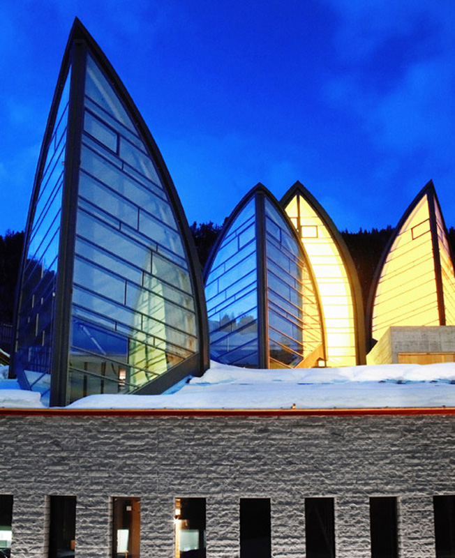 Gläserne Segel wachsen aus dem Fels. Als raumgreifende und doch filigrane Lichtbäume aus Glas und Stahl weisen sie auf Spektakuläres hin, das sich im Bergmassiv des Wintersportortes Arosa verbirgt. Mit der SPA-Ausstattung wurde Klafs beauftragt.