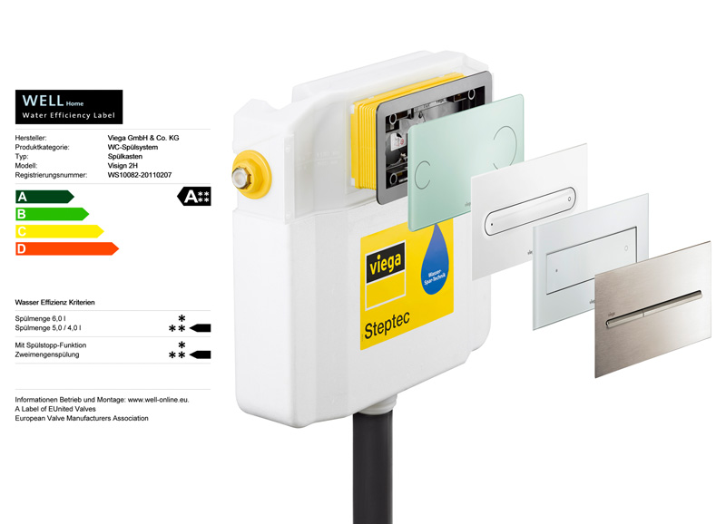 Eine Auszeichnung in der Top-Kategorie des „WELL“-Labels ging bereits an den Visign Unterputz Spülkasten der Firma Viega. Das Produkt erhielt mit vier Sternen die höchst mögliche Bewertung Effizienzklasse A. Diese resultiert aus den Kriterien Menge (Spülvolumen) und Spülprogramm (Zwei-Mengen-Spültechnik).