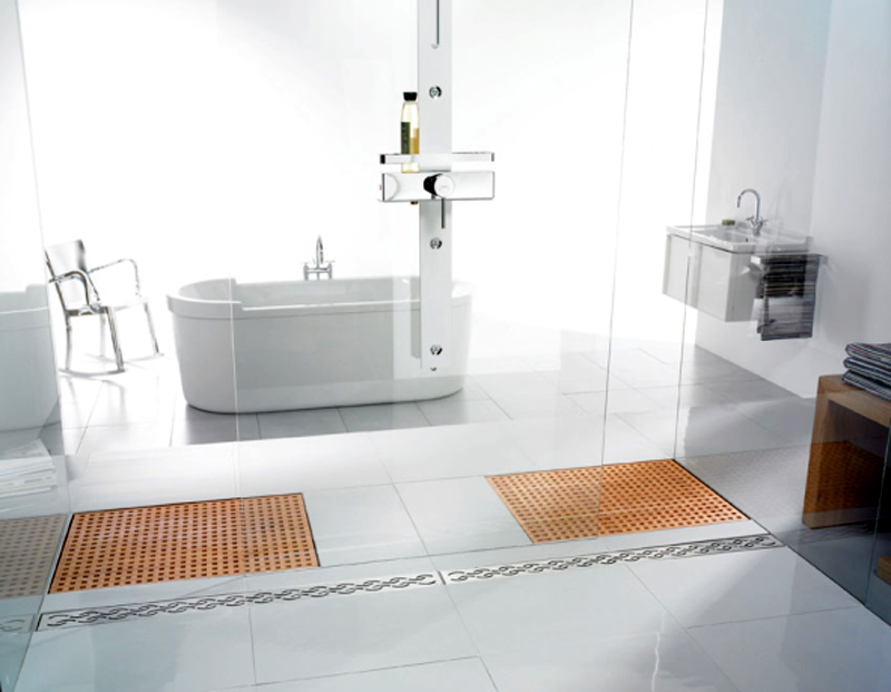 Vor der Dusche und vor dem Waschtisch dient die Edelstahlwanne unter dem Rost als Auffangbecken für Spritzwasser, das dort verdunstet. Für die Aufnahme großer Wassermengen ist die ACO ShowerDrain Walk-in mit Bodenablauf und integriertem Geruchverschluss ausgestattet. Den feinen Holzrost gibt es in zwei Varianten: aus hellem Teak- und dunklem Lapachoholz. Die neuen Abdeckungen aus Glas und Mineralwerkstoff geben zusätzlichen Gestaltungsspielraum.