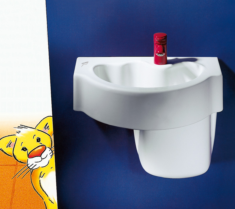 Der speziell entwickelte „Kind Waschtisch“ wächst mit, denn er kann in der jeweils idealen Höhe angebracht werden. Das geschwungene Innenbecken und eine vorgezogene Hahnlochbank erleichtert den Kleinen das Erreichen der Armatur. Der Siphon und die Eckventile können optional mit einer Halbsäule verdeckt werden.