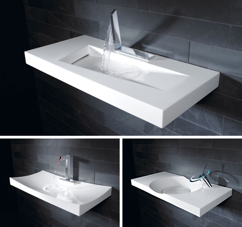 Individuelle Waschtischlösungen aus dem Mineralwerkstoff Minacor, der selbst dreidimensionale Formen problemlos zulässt und eine perfekte Allianz mit den Armaturen eingeht
