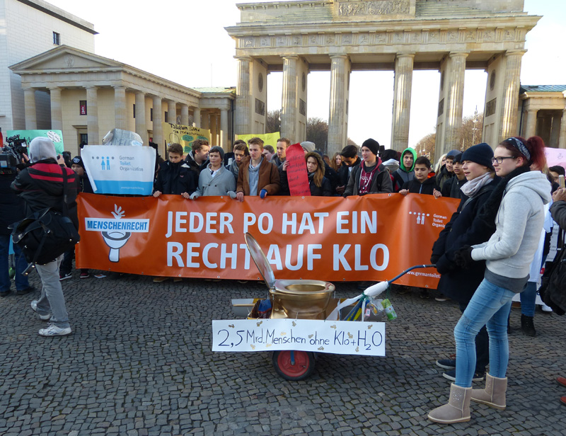 80 Berliner SchülerInnen sind anlässlich des Welttages der Menschenrechte gemeinsam mit der German Toilet Organization e.V. mit einem bunten Demonstrationszug vom Deutschen Institut für Menschenrechte zum Brandenburger Tor gezogen, um auf die weltweite Wasser- und Sanitärkrise aufmerksam zu machen. Obwohl Wasser und Sanitärversorgung seit 2010 ein Menschenrecht ist, leben laut WHO und UNICEF 2,5 Milliarden Menschen ohne Zugang zu Toiletten.