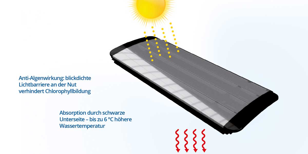 Spezielle Solarlamellen von WaterBeck können das Poolwasser darüber hinaus sogar erwärmen – und das ganz ohne zusätzlichen Energieaufwand. Die Solarprofile erhitzen laut Hersteller das Schwimmbecken nur mit der Kraft der Sonne um bis zu 6 °C. Das macht sich insbesondere in den Frühjahrsmonaten positiv bemerkbar. Für den Heizeffekt sorgen Lamellen aus mehrfachextrudiertem Polycarbonat: Sie sind mit einer transparenten Oberseite und einer schwarzen Unterseite ausgestattet. Die transparente Oberseite der Profile lässt Sonnenstrahlen passieren und die schwarze Unterseite absorbiert die Wärmeenergie an das Wasser. Auf diese Weise können die Betriebs- und Heizkosten für den Pool um rund 80 Prozent gesenkt werden.