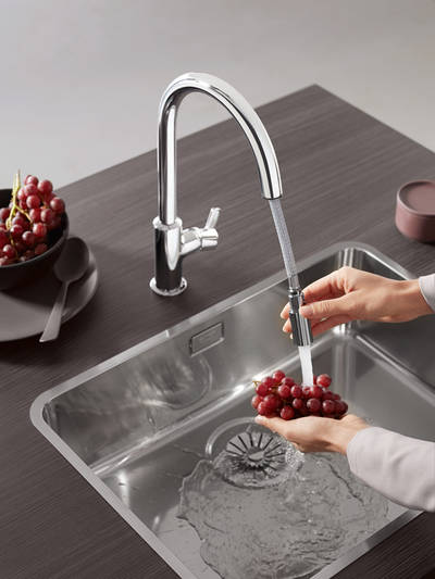 Bingo Star XS – hinter dem modernen Namen verbirgt sich eine Neuinterpretation der klassischen Bogenarmatur. Ihr hochgeschwungener, schlanker Körper erhebt sich elegant über die Küchenspüle und bietet dadurch bereits viel Bewegungsfreiheit. Die verchromte Version des Einhandmischers ohne Auszug ist außerdem um 360 Grad schwenkbar und damit perfekt für die Kochinsel. Die Version mit Auszugsauslauf kommt immer noch auf einen 230 Grad-Radius, ihre Besonderheit sind jedoch die Farbvarianten: Mit einem matt-weißem, mehr noch einem matt-schwarzem Hals wirken die Armaturen elegant und cool.