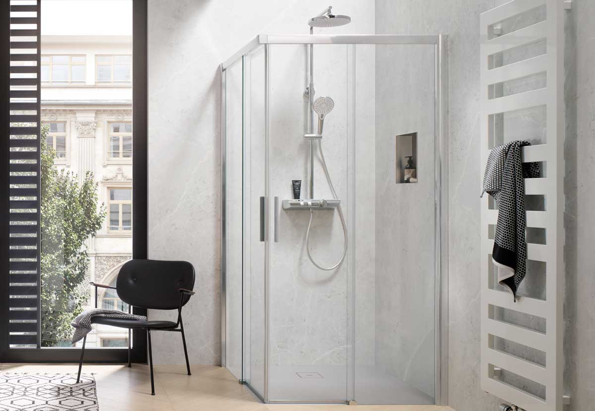 Ob als Nische, Eckeinstieg oder Runddusche – die Modellvielfalt der Serie Favorit macht es möglich, für jede Raumsituation die passende Schiebetür-Lösung zu finden. Ein besonderes Highlight stellt die Walk In Schiebetür dar. Ob direkt neben einer Badewanne, im Schlauchbad oder gegenüber eines Fensters vergrößert sie die Duschzone und erhöht damit den Spritzschutz. So kann selbst in kleinen und verwinkelten Badezimmern ein zeitgemäßer Walk In Duschplatz realisiert werden. Ergänzt werden die Auswahlmöglichkeiten durch verschiedene Profilfarben wie Chromoptik, Alu Silber-matt oder Schwarz-matt. Die Betätigung der Schiebetüren erfolgt mithilfe von elegant reduzierten Griffen in Chrom. Damit harmonisieren die Duschkabinen mit unterschiedlichsten Badezimmer-Farbkonzepten – für einen Look wie aus einem Guss.