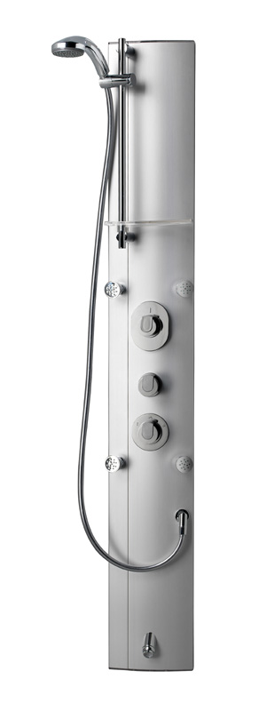 Bei beiden Modellen ist der Korpus aus satiniertem Aluminium, in den innerhalb eines raffinierten Material-Mix eine Ablage aus Acryl eingearbeitet ist – beim Modell P15 dezent in einer durchsichtigen, beim Modell P13 in einer akzentuierten gelb glänzenden Version. Beide Paneele sind mit jeweils 4 Massagedüsen ausgestattet und erfrischen den Körper mit einer erfrischenden Massage.