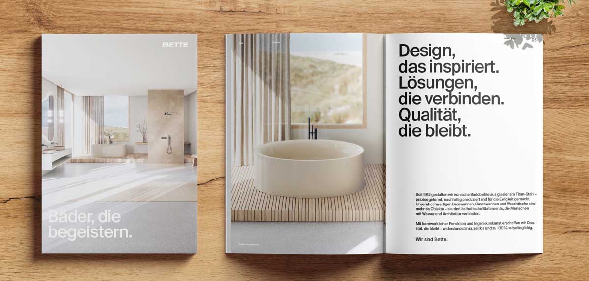Mit einem neuen Brandbook bringt die Bette GmbH & Co. KG seine Markenwerte, Kompetenzen und Produkte in komprimierter Form auf den Punkt. Die Broschüre richtet sich an Architekten, Badplaner und Fachpartner, die sich einen schnellen Überblick über das Unternehmen verschaffen möchten (Quelle und Fotos: Bette).