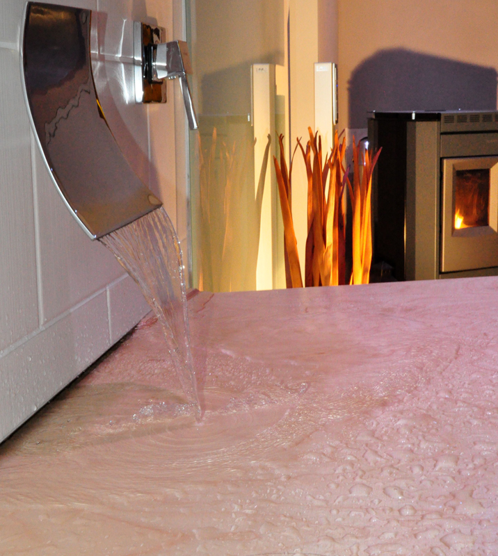 Für den Durschbereich entschied sich der Architekt für eine Linienentwässerung mit Hilfe der „TersoWALL“-Duschrinne von MEPA. Das abfließende Wasser läuft vom Duschbereich seitlich durch die offene Fuge unter dem Sockelprofil in den Ablauf der Duschrinne und verschwindet anschließend in den Kanal. Von der Technik begeistert, setzte er "TersoWall" auch für den selbst entworfenen Waschtisch ein.