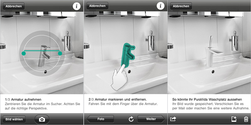 Erstens: Den Waschtisch im eigenen Bad fotografieren. Zweitens: Die vorhandene Armatur auf dem Foto mit dem Finger auf dem Touchscreen markieren. Drittens: Die App radiert die bestehende Armatur digital aus und fügt dann die neue Armatur an dieser Stelle in das Bild ein. Das so entstandene Foto zeigt, wie der Waschplatz mit neuer Designer-Armatur aussehen kann. Das Foto lässt sich an Freunde und Verwandte schicken oder für eine spätere Betrachtung speichern.