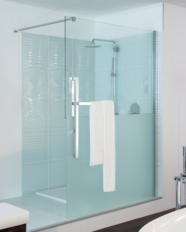 Die beiden horizontal übereinander angeordneten Glassegmente schaffen einen großzügigen, barrierefreien Duschbereich mit einer Seitenwandgröße von bis zu 2 mal 2 Meter. Für die gewisse Diskretion sorgen das Combidekor „Sand Plus“: Die untere Glasscheibe ist mattiert und blickdicht, die obere Scheibe glasklar. So wird der Duschbereich zum diskreten, aber dennoch hellen Raum, denn die mattierte Scheibe bietet Sichtschutz ohne den Innenraum der Dusche zu verdunkeln.