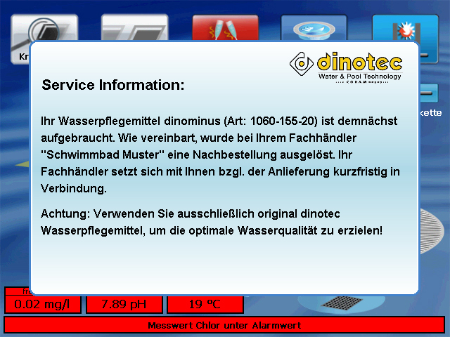 Was steckt dahinter? Das dinotec Pool- und Spa-Managementsystem überwacht die komplette Schwimmbadtechnik inkl. der Kanisterfüllstände der Wasserpflegemittel (Chlor oder Aktivsauerstoff, pH,Flockung). Erreicht einer der Kanisterfüllstände den Reservebereich erscheint auf dem Bildschirm des dinotecNET+ Systems eine entsprechende Meldung. Hat der Kunde eine entsprechende Vereinbarung mit seinem Fachhändler getroffen, sendet das System simultan eine Email-Bestellung direkt an den zuständigen Fachhändler. Dieser muss dann nur noch die Anlieferung mit dem Kunden vereinbaren.