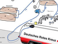 Das Deutsche Rote Kreuz flog eine DRK-Trinkwasser- und Seuchenvorsorge-Einheit TWS 15 in die Überschwemmmungsregion nach Pakistan. Täglich können damit bis zu 15.000 Personen mit frischem Wasser versorgt werden.