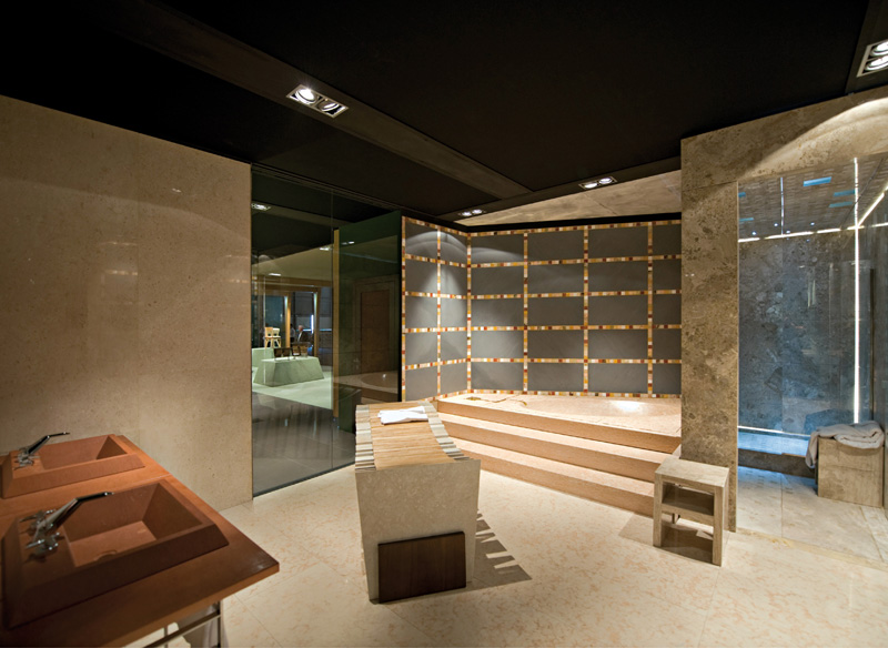 Die Präsentation zeigt zwei Suiten, einen Theatersaal, eine kleine Fitnesszone, eine Lounge-Bar und die Rezeption des Grand Hotel Salgari. Verbindendes Element ist das Thema eines Grand Hotels in unserer Zeit, ausgestattet mit zeitgemäßem Design und traditionellen Materialien wie Naturstein, Marmor und Holz.