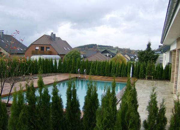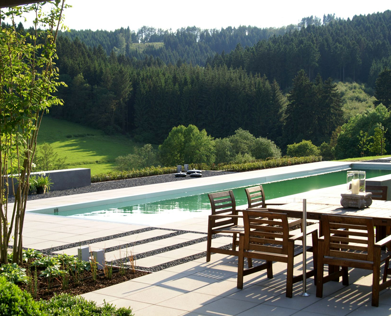 Das regnerische Eifelwetter war nicht die einzige Herausforderung, mit der sich Frau Heinrichs bei der Umsetzung dieses Schwimmteiches konfrontiert sah. Die erfahrene Swimming-Teich-Spezialistin der Firma Gartenhof Küsters musste auch den gewaltigen Höhenunterschied im Garten terrassieren, um einen bequemen und optisch anspruchsvollen Zugang vom modernen aber auch wohnlich gestalteten Haus zum Schwimmteich zu schaffen. Der Auftrag umfasste nicht nur den Teich, sondern die architektonische Gestaltung des gesamten Gartens. Neben den Wünschen des Ehepaares mussten auch den Vorstellungen von fünf Kindern im Teen- und Twen-Alter Rechnung getragen werden. Der Garten bietet nun vielerlei Plätze zum Betrachten und Verweilen, ganz unterschiedlich gestaltet, je nach Nutzer. Durch eine Sauna im Haus und ein Badehaus draußen wurde noch der Wunsch der gesamten Familie erfüllt, den Teich ganzjährig zu nutzen.