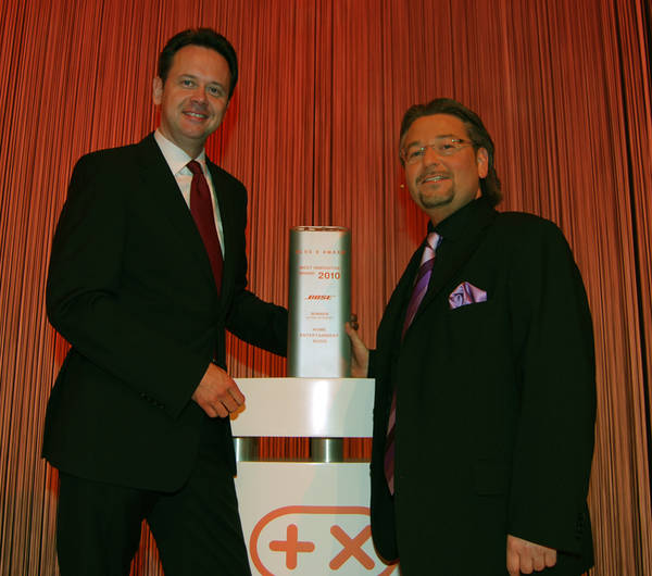 - Jürgen Imandt, Bose Manager Public Relations, Advertising and Communications und Donat Brandt, Präsident des Plus X Awards mit der Trophäe "Most Innovative Brand of the Year"