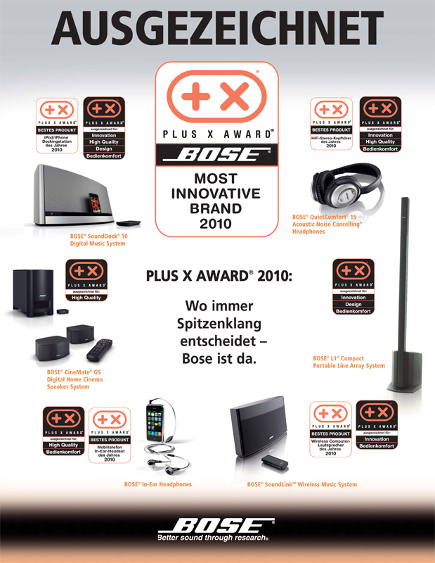 Beim Plus X Award 2010 wurde Bose erneut mit dem "Most Innovative Brand Award" in der Kategorie Home Entertainment Audio geehrt. Nach 2007 und 2008 erhielt das Unternehmen nun zum dritten Mal diese besondere Auszeichnung. Außerdem vergab die unabhängige internationale Jury Auszeichnungen für sechs aktuelle BOSE® Produkte. ® Produkte vergeben. Vier davon erhielten sogar das in diesem Jahr erstmals pro Produktgattung vergebene Siegel "Bestes Produkt des Jahres".