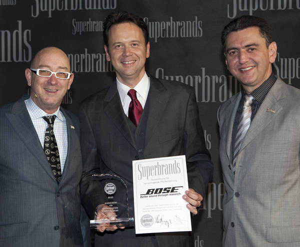 - V.l.n.r.: Rhett Lego (Project Director Superbrands Germany), Jürgen Imandt (Bose Manager Public Relations, Advertising & Communication), Eamonn Sadler (Superbrands CEO)